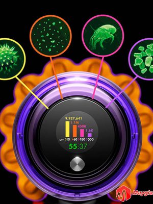 Một bộ cảm biến bụi được gắn trong đầu hút sẽ theo dõi lượng bụi nó hút vào và phân loại theo kích thước thành biểu đồ thanh đầy màu sắc trên màn hình kỹ thuật số.